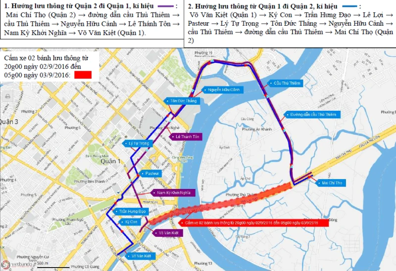 Kể từ 20 giờ ngày 2-9 đến 5 giờ ngày 3-9, cấm tất cả các loại xe hai bánh lưu thông trên đường Võ Văn Kiệt - đường hầm sông Sài Gòn - đường Mai Chí Thọ, đoạn từ đường Ký Con (quận 1) đến đường dẫn cầu Thủ Thiêm (quận 2) theo cả hai hướng lưu thông. Lộ trình thay thế: