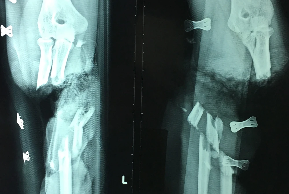 Kết quả chụp X quang cho thấy tay trái bệnh nhân bị lưỡi dao cắt đứt lìa. Ảnh: HÒA KHÁNH