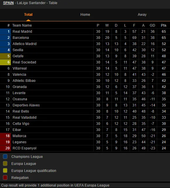 Bảng xếp hạng La Liga: