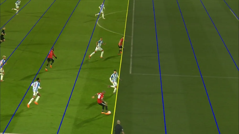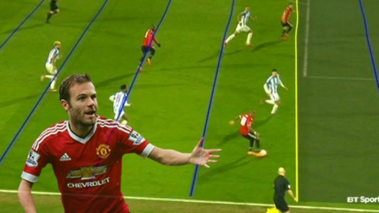 Hình ảnh này cũng được đơn vị sở hữu chuyển cho kênh truyền hình BT Sports mang dạng phân tích và cho thấy Mata còn đứng phía trên hậu vệ cuối cùng của Huddersfiel một khoảng cách xa dựa trên cự ly của Mata với sọc kẻ vạch cỏ trên sân.