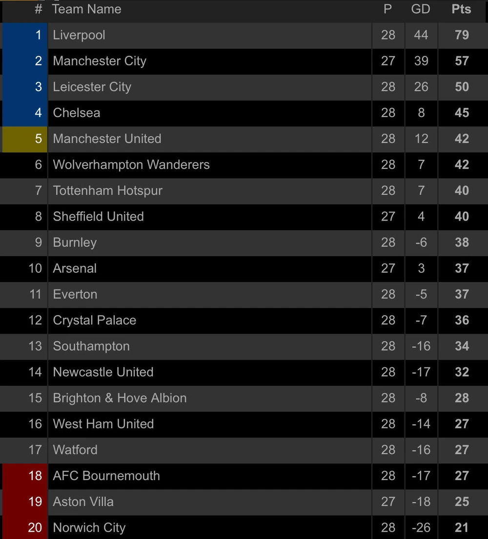 Hòa Everton với tỉ số 1-1, MU bỏ lỡ cơ hội rút ngắn khoảng cách với đội thứ tư là Chelsea. Sau 28 vòng đấu tại Premier League, Man. United có được vị trí thứ 5 với 42 điểm, Man. United hòa trận này thì Chelsea là đội vui nhất khi đội bóng của HLV Lampard tiếp tục giữ khoảng cách 3 điểm với “Quỷ đỏ”.