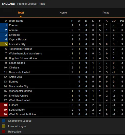 Thắng Chelsea 2-0 ngay trên sân khách, ĐKVĐ Liverpool vươn lên vị trí số 3 trên bảng xếp hạng Premier League với 6 điểm sau 2 trận. Hiện Everton và Arsenal đang xếp vị trí nhất và nhì cùng có 6 điểm nhưng hiệu số tốt hơn Liverpool. Crystal Palace cũng toàn thắng sau 2 trận xếp thứ 4.