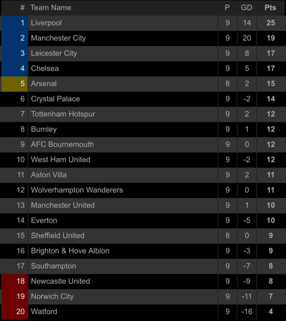 Trong khi đó, mặc dù Man. United có được 1 điểm trên sân nhà, nhưng đội bóng của HLV Solskjaer vẫn chưa thể làm hài lòng CĐV. Bởi sau 9 vòng đấu Man. United chỉ có được vị trí thứ 13 trên bảng xếp hạng với 10 điểm.