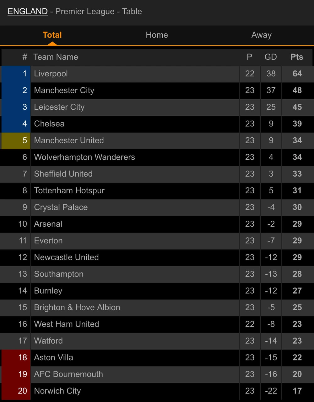 Vòng 23 Premier League, Liverpool được hưởng lợi lớn khi hai đối thủ xếp sau là Man. City và Leicester City đều nhận kết quả bất lợi. “Man xanh” để Crystal Palace cầm hòa với tỉ số 2-2 còn Leicester City bất ngờ thua sốc Burnley 1-2. Tuy nhiên ở vòng đấu này, Liverpool muốn xây chắc ngôi đầu thì phải thắng Man. United trên sân Anfield, khi mà “Quỷ đỏ” đang khao khát chiến thắng để kịp chen chân vào tốp 4.