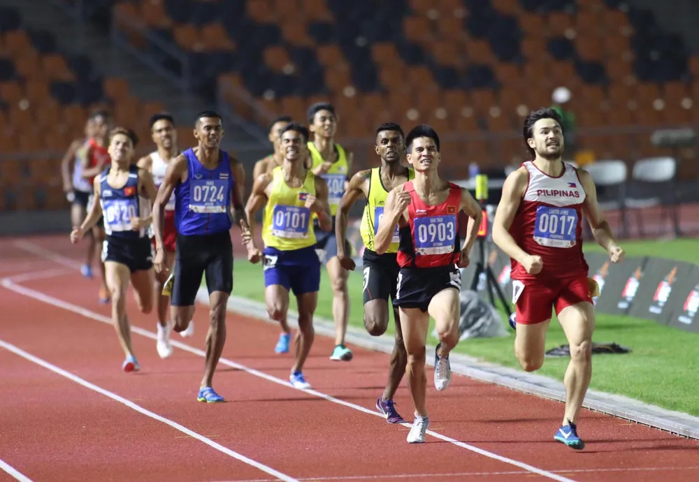 Dương Văn Thái vượt mặt chủ nhà Philippines ở 100 m cuối để giành HCV nội dung 800 m nam. Ảnh: QUANG LIÊM
