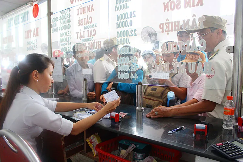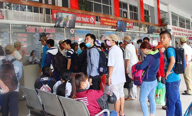 Tại quầy vé về Tiền Giang, Bến Tre mọi người xếp hàng để mua vé và phải đợi khá lâu vì số lượng xe không đủ đáp ứng. Nhân viên bảo vệ được huy động đến khu vực này để hỗ trợ phụ nữ, trẻ em, người già, phụ nữ có thai mua vé và đảm bảo trật tự.