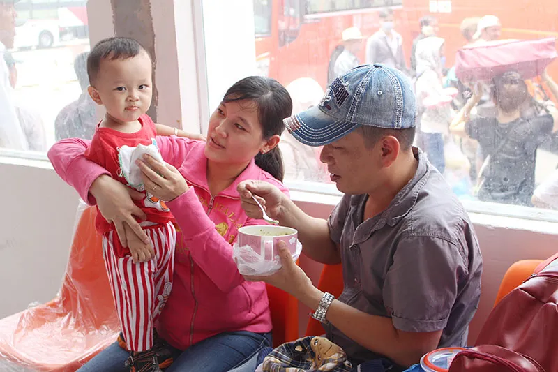 Bà con tranh thủ ăn uống khi đợi xe. Ảnh: LÊ THOA