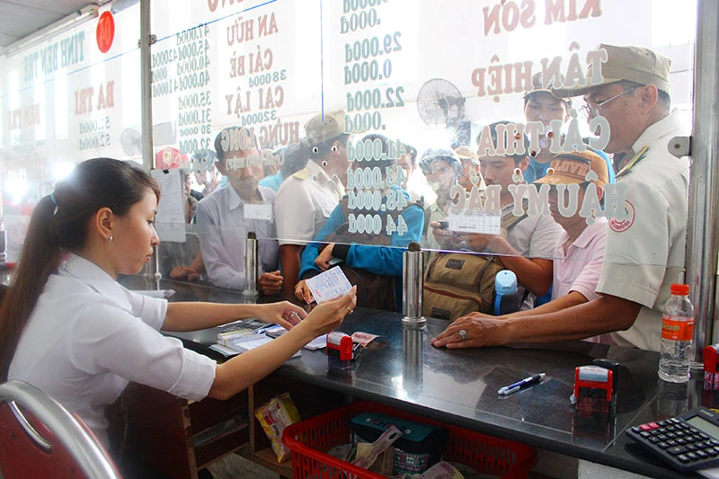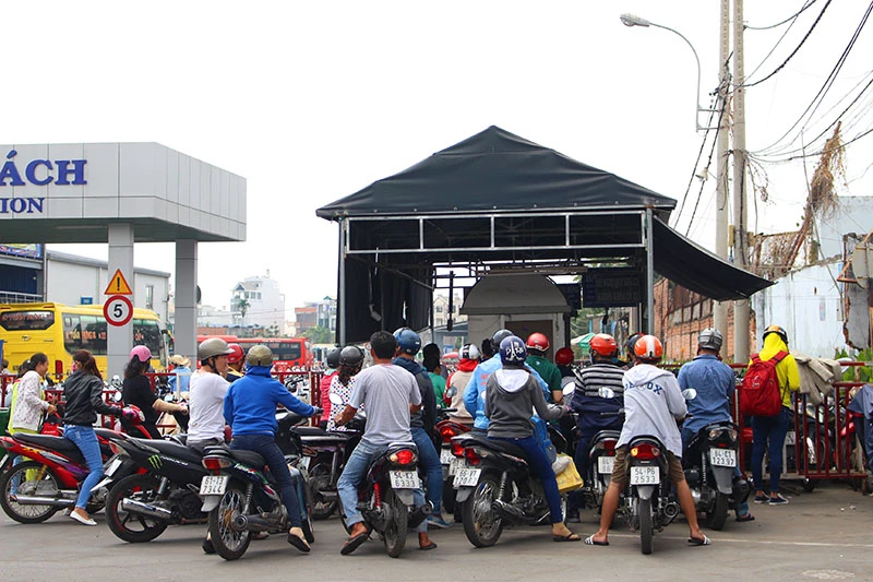 Xếp hàng mua vé về Tiền Giang ngày 16-4. Ảnh: LÊ THOA