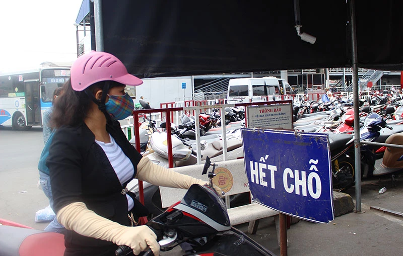 Chị Loan đi xe tay ga nhưng phải chạy ra ngoài kiếm chỗ khác gửi xe vì nhà xe hết chỗ. “Chúng tôi đang vội về miền Tây nghỉ lễ mà nhà xe không có chỗ gửi, trong khi sắp đến giờ xe chạy rồi, không biết có chỗ nào gửi xe không" - chị Loan lo lắng.