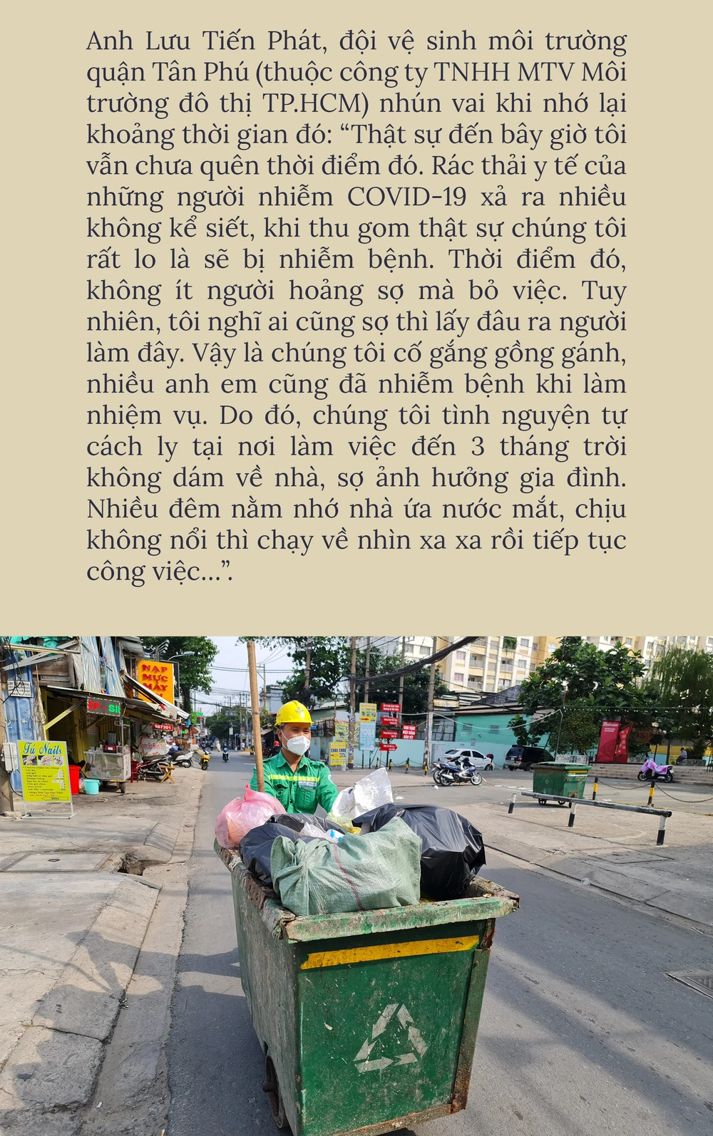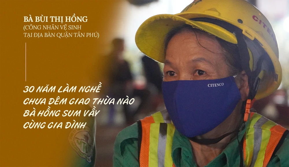 Chuyện buồn thì bao la, chuyện vui cũng không ít. Có bữa đi làm, gặp bé gái chừng 8-9 tuổi, nó thấy mình mần cực, chạy ra cho mình chai nước với cái bánh, nó nói “Bà giống nội con quá, thấy bà cực, mốt con hỏng xả rác nữa hén. Nghe vậy thấy vui nguyên ngày. Cuộc sống mà, ráng nhớ những cái tốt đẹp để vui sống nhen”- bà Bùi Thị Hồng (công nhân vệ sinh tại địa bàn quận Tân Phú) bộc bạch.