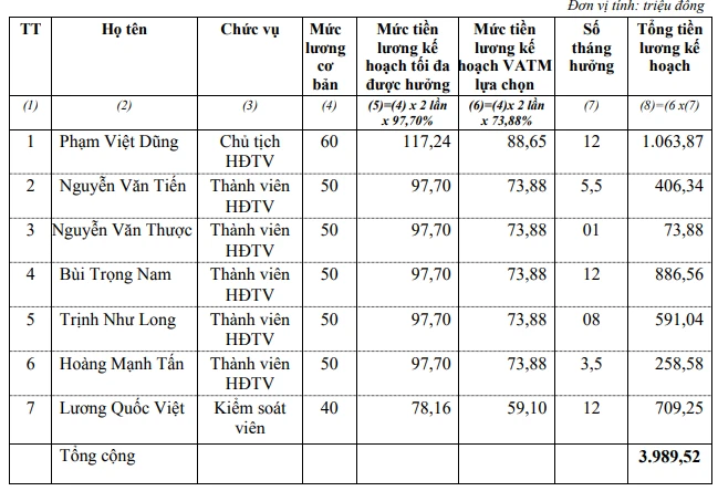Nhưng do tình hình tài chính khó khăn,VATM lựa chọn mức tiền lương kế hoạch năm 2020 của Hội đồng thành viên và Kiểm soát viên thấp hơn mức tối đa được hưởng và bằng 2 lần mức lương cơ bản nhân với tỷ lệ (%) tỉ suất lợi nhuận kế hoạch năm 2020.