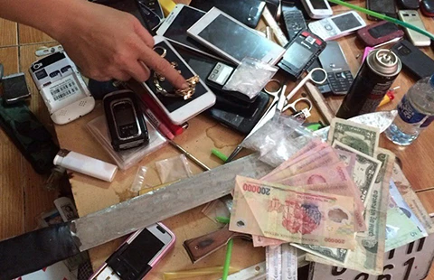 Kiểm tra các phòng, cảnh sát thu giữ bảy bịch ma túy tổng hợp (hơn 41 g), hai bịch heroin (300 g), 42 viên hồng phiến, 37 điện thoại di dộng, tám xe máy, hai bảng số xe, roi điện, mã tấu, dao lê và một số nữ trang kim loại màu vàng như nhẫn, lắc tay, dây chuyền, đồng hồ...