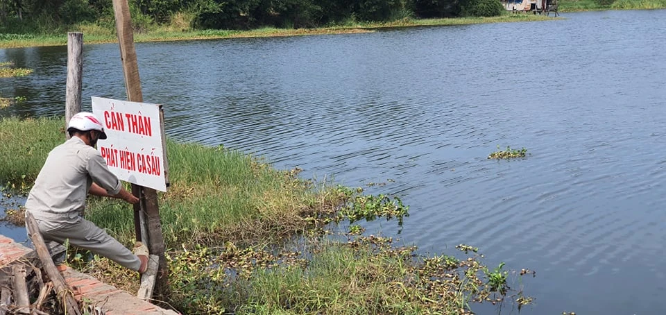 Lực lượng chức năng của phường 12, TP Vũng Tàu cắm biển cảnh báo cá sấu quanh hồ chờ phương án xử lý. Ảnh: KL