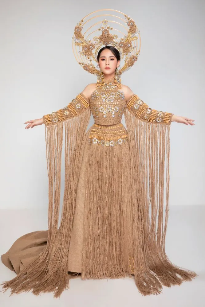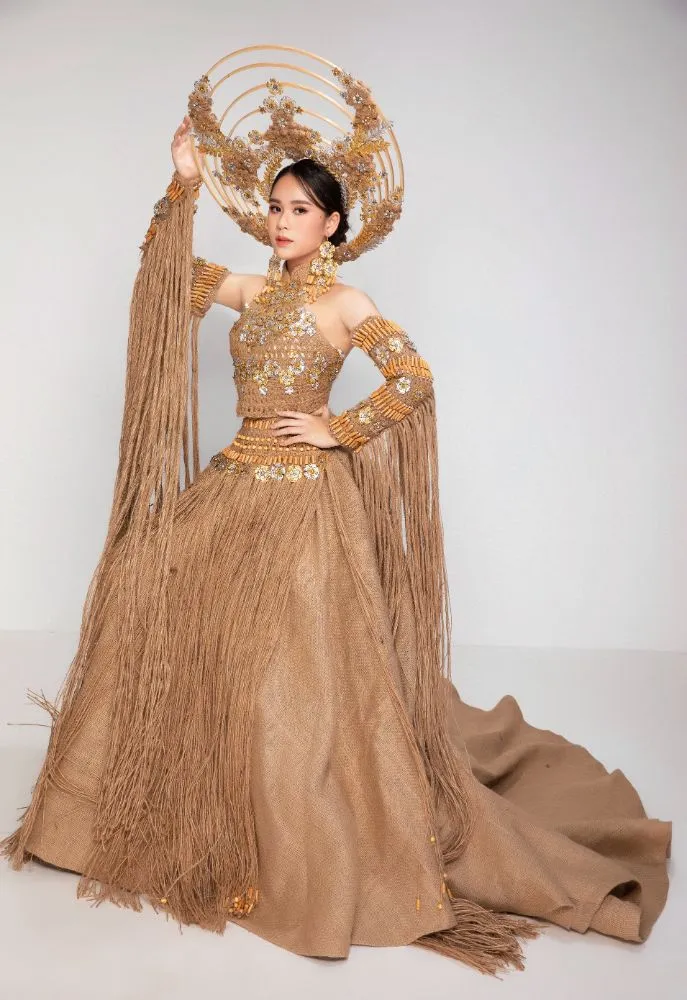 Trang phục của Bella Vũ Huyền Diệu mang đến đấu trường sắc đẹp này có tên gọi “Việt Nam- Rừng vàng biển bạc” nặng hơn 20 ký của NTK Việt Hùng. Bộ trang phục hoàn toàn làm từ chất liệu sợi đay.