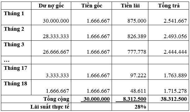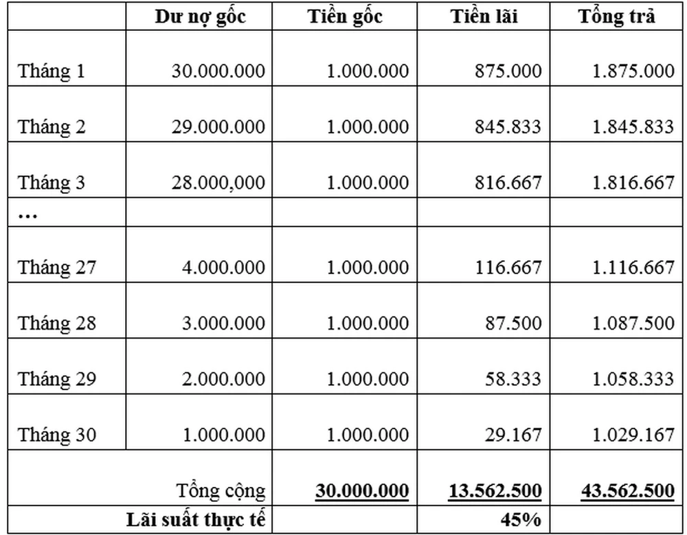Khách hàng A, trả gốc 1.000.000 đồng/tháng và trả góp trong 30 tháng thì lãi suất thực tế lên đến 45%.