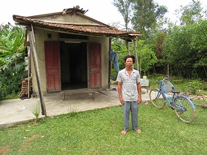 Anh Dương Văn Điệp trong căn nhà nghèo bị thôn lấy mất tiền từ thiện bão lụt. Ảnh: MINH QUÊ