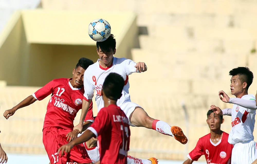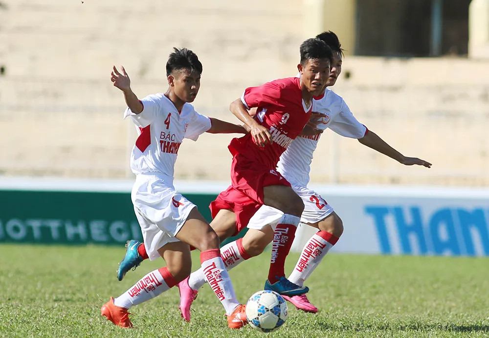 Các cầu thủ U-19 Bình Định (áo đỏ) thi đấu rất cố gắng... Ảnh: DŨNG PHƯƠNG