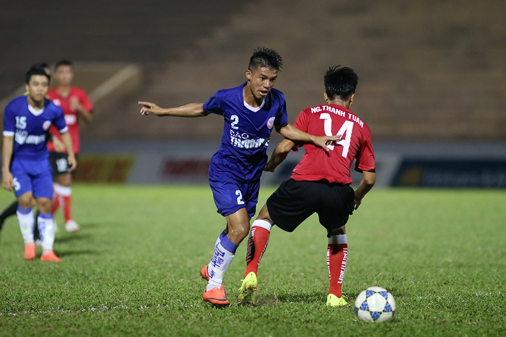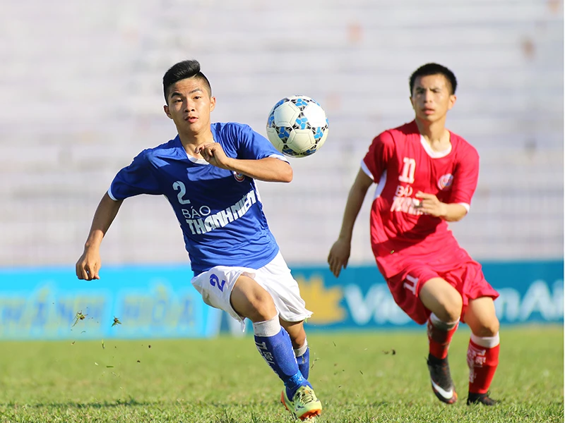 Sau trận thua 0-8 trước U-19 Viettel, U-19 Long An (áo đỏ) tiếp tục thua U-19 Bình Định. ẢNH: DŨNG PHƯƠNG