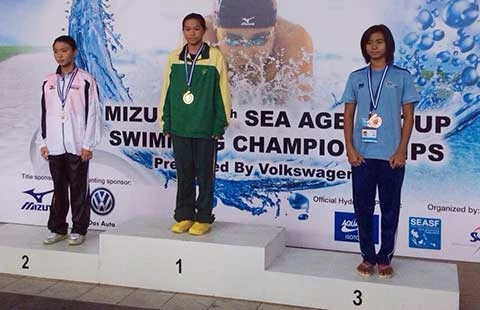 Phương Trâm (giữa) nhận huy chương vàng ở giải vô địch nhóm tuổi Đông Nam Á năm 2014 tổ chức tại Singapore. (Ảnh do gia đình cung cấp)