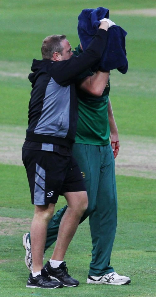 Sau khi được chăm sóc, Luke Fletcher được nhân viên y tế dìu khỏi sân với khăn trùm kín mặt.