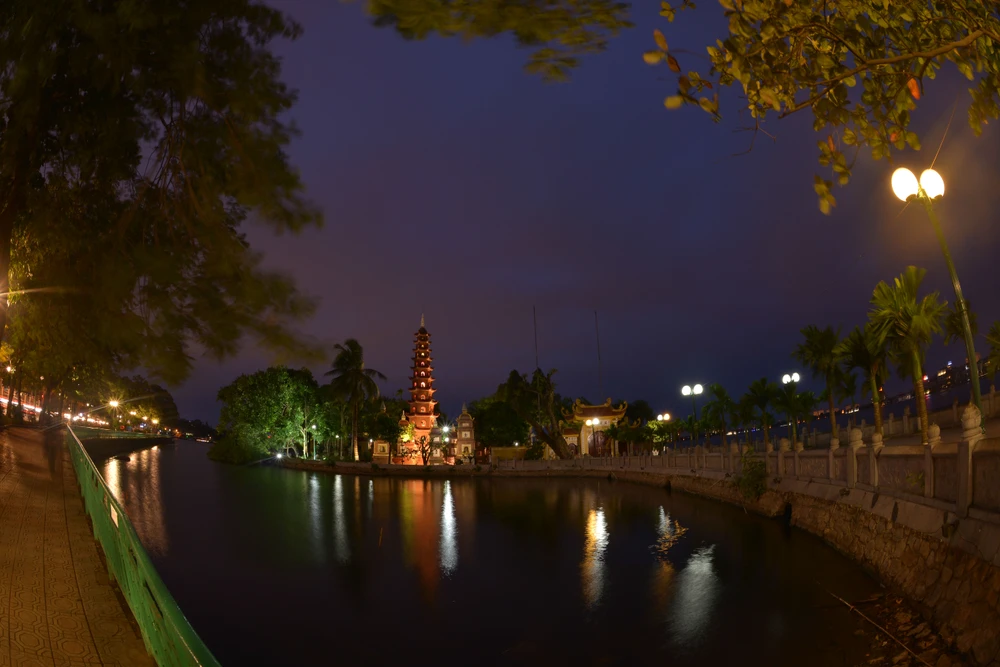 Chùa Trấn Quốc nhìn vào buổi đêm sáng lung linh