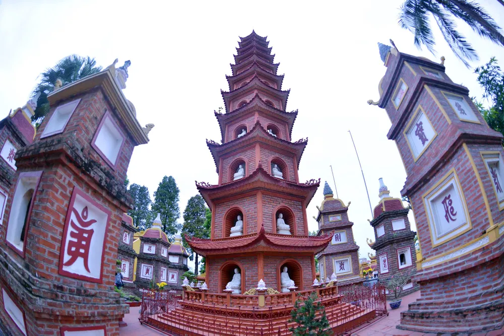 Khuôn viên chùa có Bảo tháp lục độ đài sen được xây dựng năm 1998.