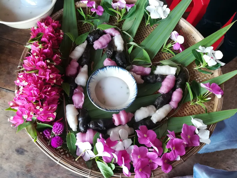 Bánh lá mơ được cuộn lại thành từng miếng nhỏ, trang trí cùng hoa giấy. Ảnh: TUYỀN-THOA