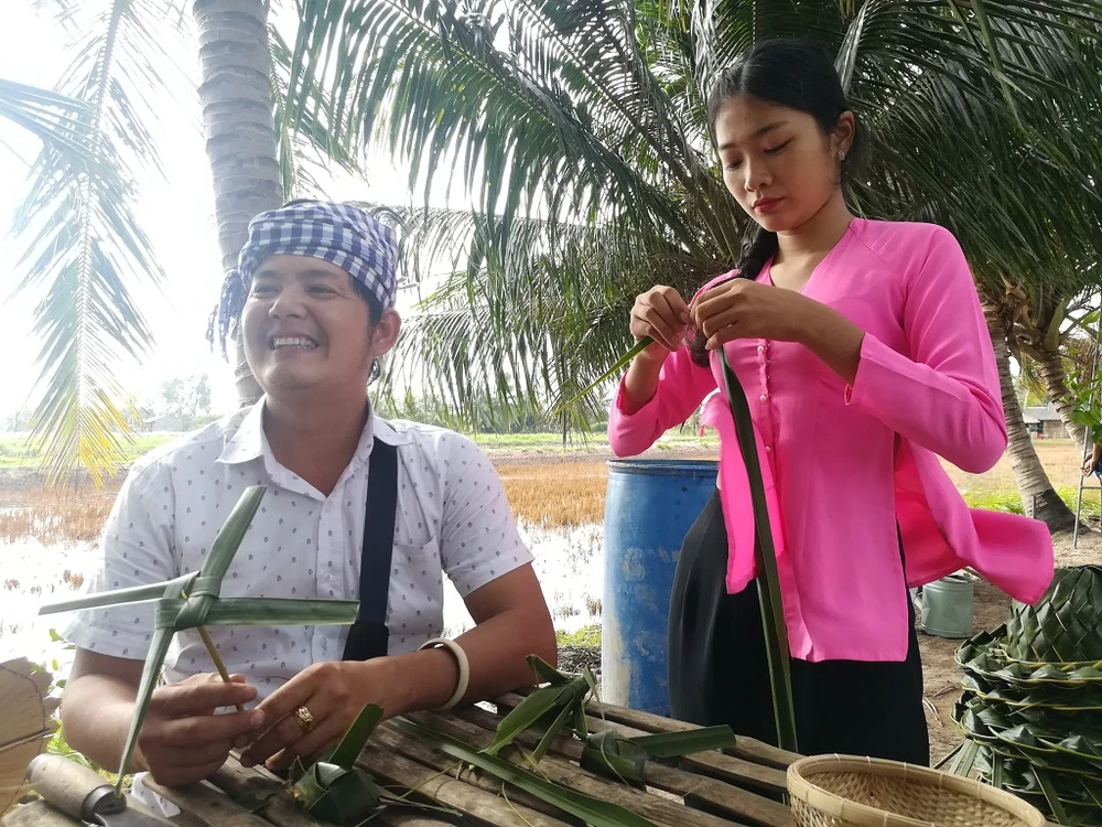 Du khách thích thú với trải nghiệm dùng lá dừa làm đồ trang trí. Ảnh: TUYỀN-THOA
