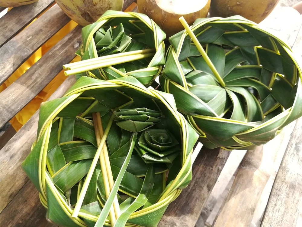 Sản phẩm làm từ lá dừa được các hướng dẫn viên hướng dẫn cho du khách cùng làm. Ảnh: TUYỀN-THOA