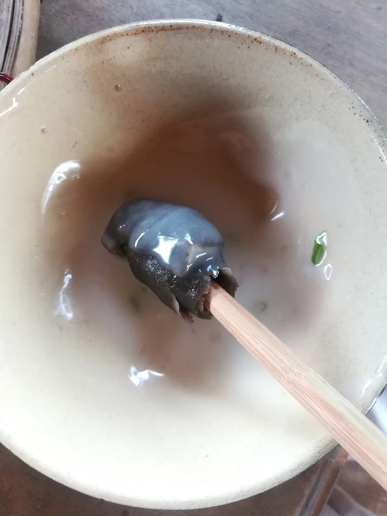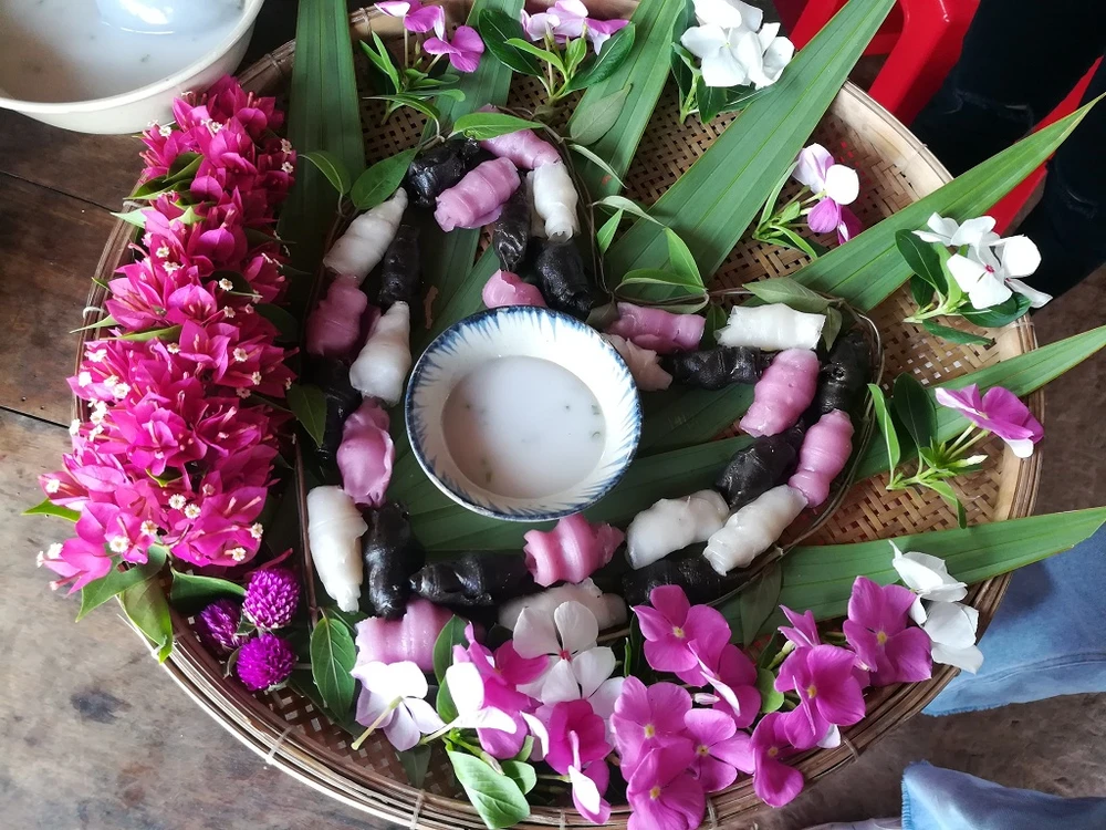 Bánh lá mơ được người dân địa phương tận dụng lá mơ trong vườn nhà để làm. Du khách dùng đũa để lấy bánh ra, sau đó cuộn tròn miếng bánh lại (như ảnh trên mà chúng tôi cung cấp) rồi thưởng thức. Ảnh: TUYỀN-THOA
