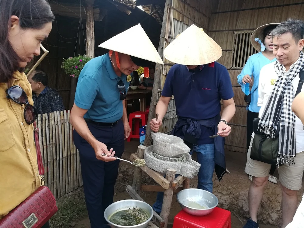 Du khách trải nghiệm xay bột làm bánh lá mơ. Ảnh: TUYỀN-THOA