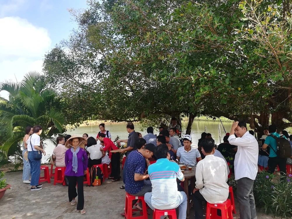 Mọi người ngồi thưởng thức sương sâm, mứt dừa do bếp nhà cô Vân nấu dưới những tán cây, bên bờ sông. Ảnh: TUYỀN-THOA