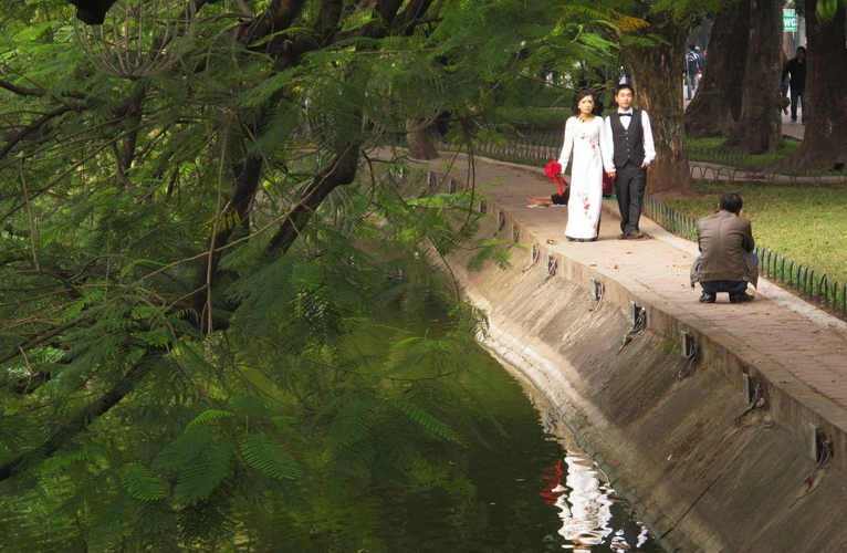 Một cặp vợ chồng sắp kết hôn tạo dáng bên cạnh hồ Hoàn Kiếm tại Hà Nội năm 2012. (Chris Brummitt/AP)