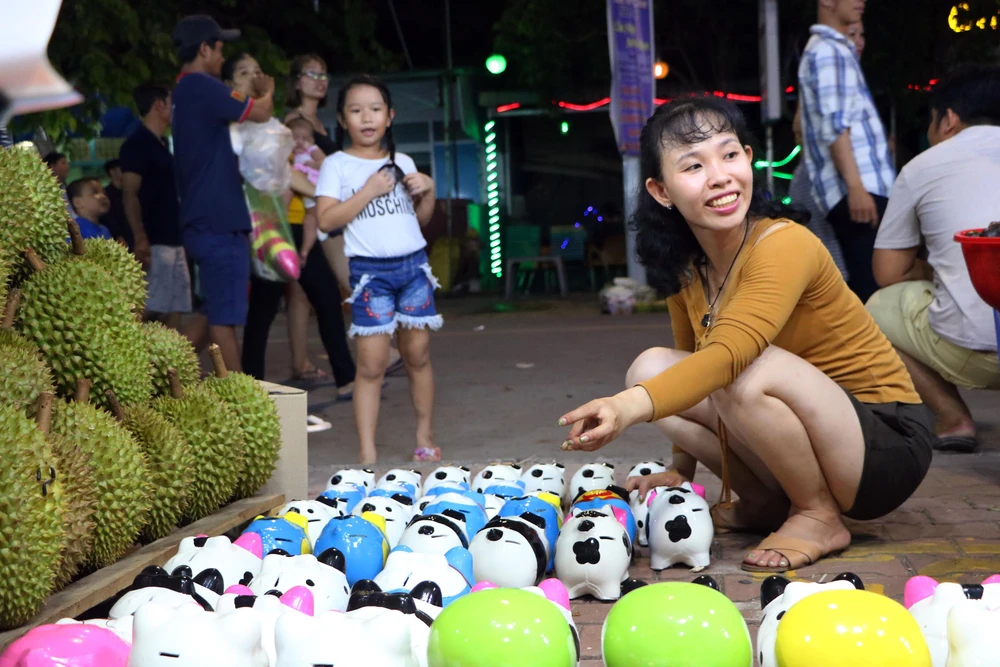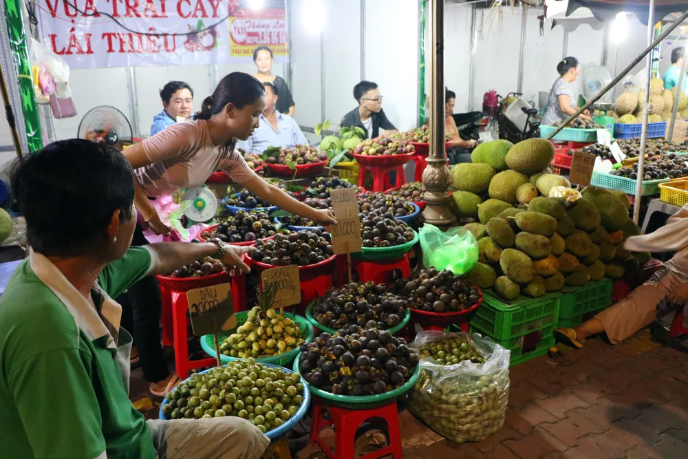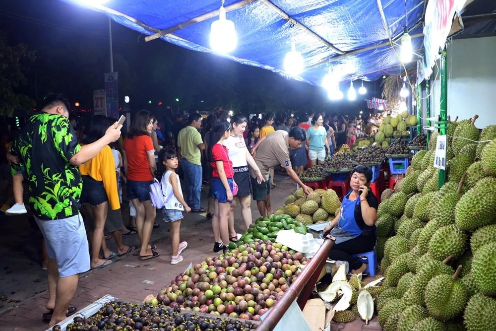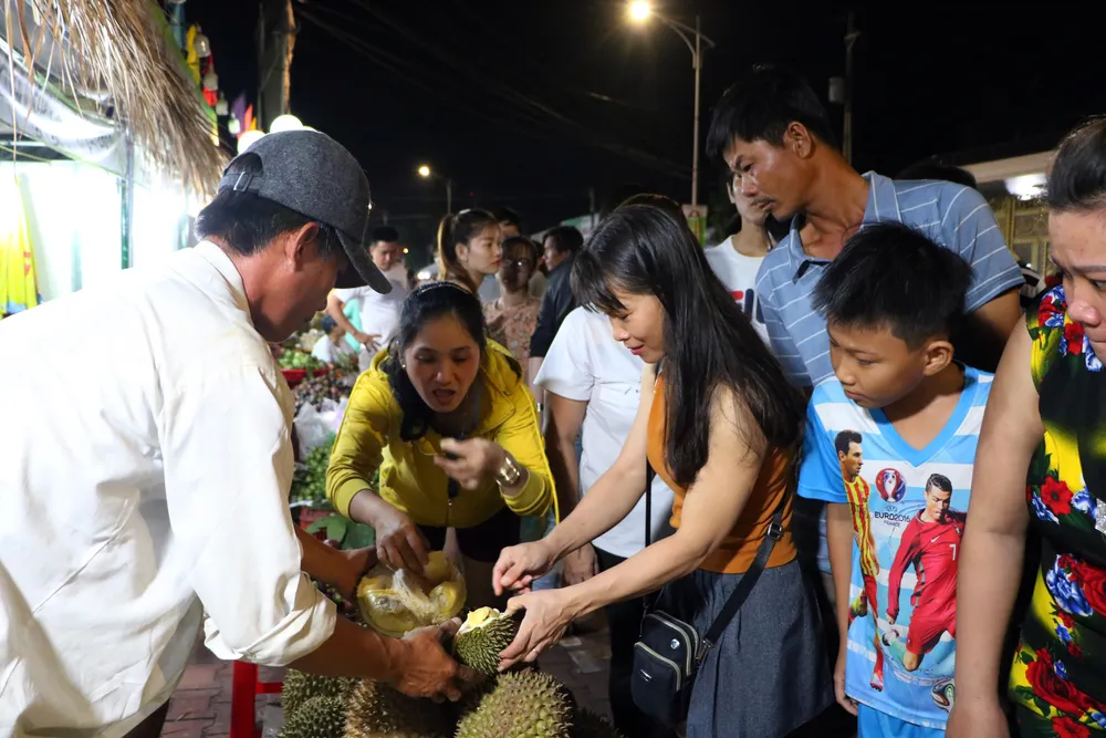 Tối 1-6, các gian hàng tại Lễ hội "Lái thiêu mùa trái chín" đông nghẹt khách, đặc biệt là các gian hàng bán trái cây.
