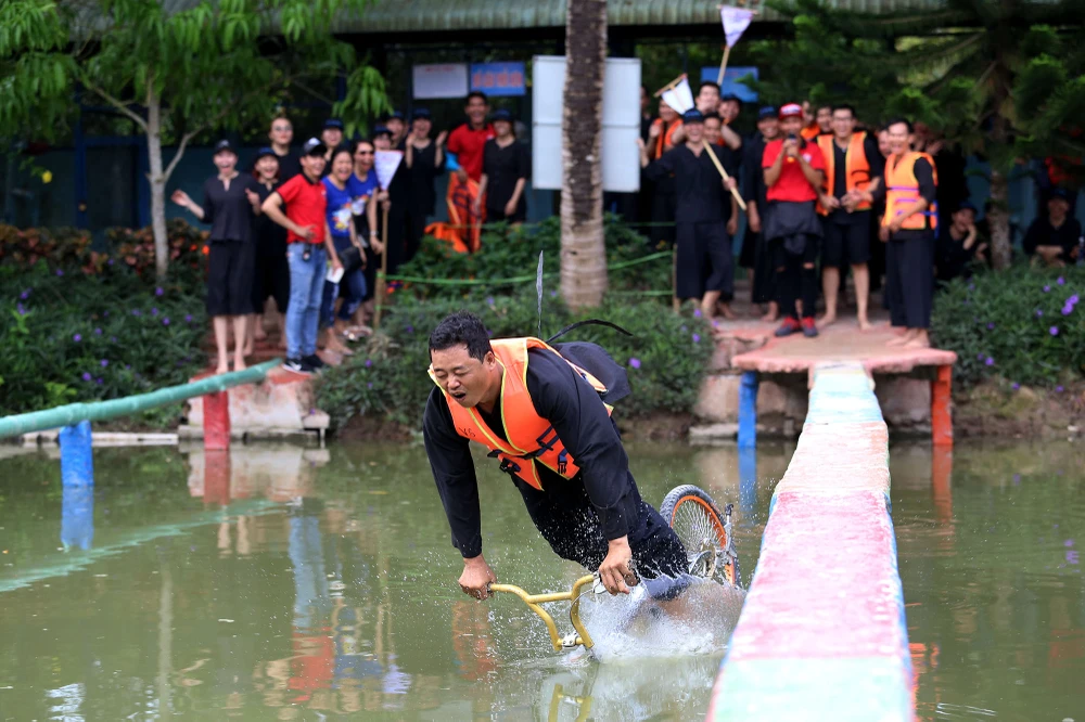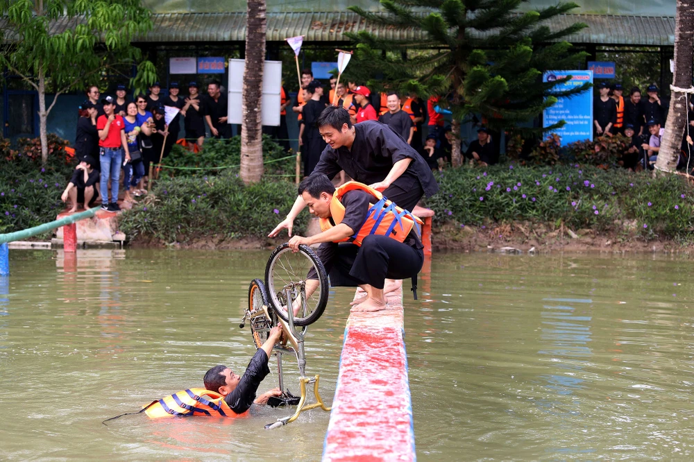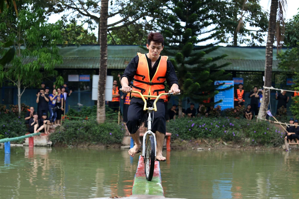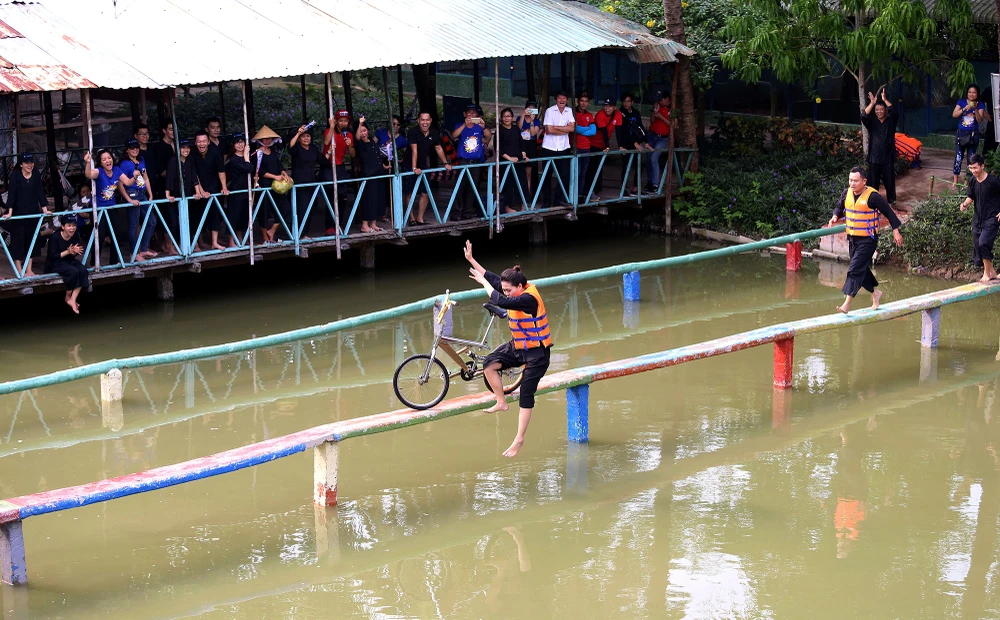 Trò chơi thử thách đi xe đạp qua cầu khỉ được nhiều người thích thú.