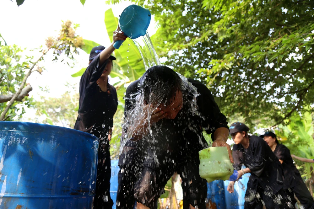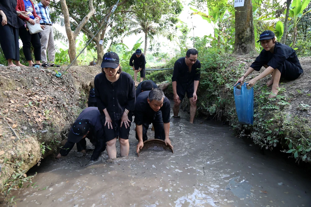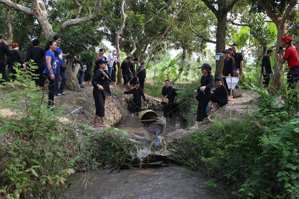 Khách tham quan mặc áo bà ba trải nghiệm việc tát ao bắt cá của người miền Tây.