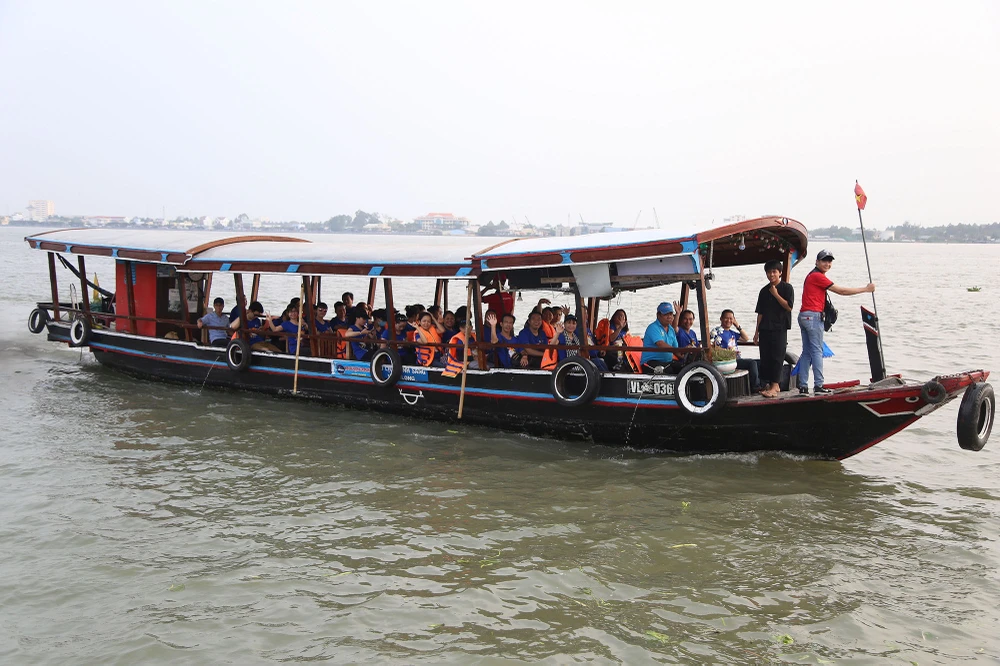 Khách tham quan đi tàu qua cù lao An Bình để đến Khu du lịch Vinh Sang.