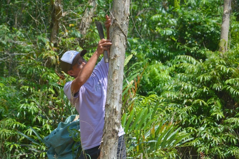 Anh Nhân đi tìm vỏ tràm ở những cây tràm có độ tuổi trung bình 3-5 năm về làm tranh. Ảnh: NGUYỄN DƯƠNG