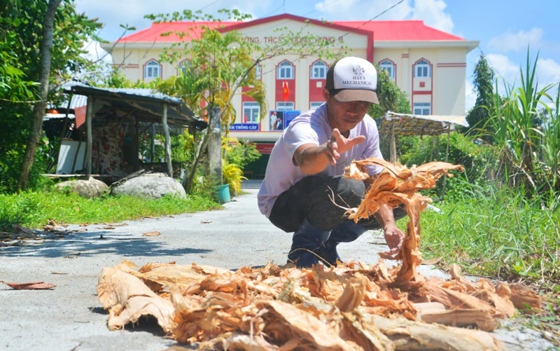 Vỏ tràm được đem phơi nắng trước khi làm tranh. Ảnh: NGUYỄN DƯƠNG
