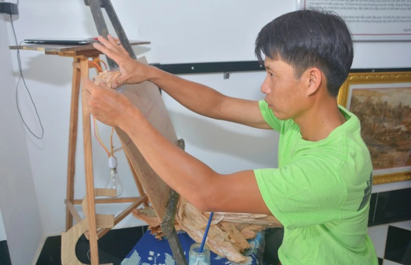 Sau khi phác họa bức tranh định làm, anh Nhân trét keo vào bìa tranh trước khi dán vỏ tràm. Dán vỏ tràm xong, anh dùng cọ dặm kéo lại để tránh không bị bong tróc. Tiếp đó, dùng bút chấm thêm màu để bức tranh có điểm nhấn. Ảnh: NGUYỄN DƯƠNG