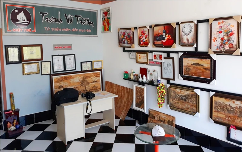 Phòng trưng bày tranh và những giấy chứng nhận về tranh vỏ tràm của anh Lê Hoàng Nhân. Ảnh: NGUYỄN DƯƠNG