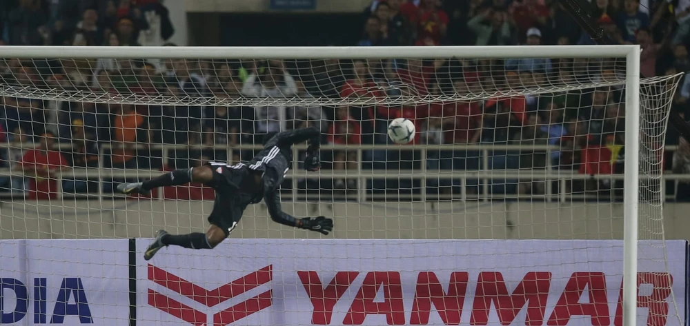 Thủ môn của UAE tung người hết cỡ vẫn không với tới bóng.