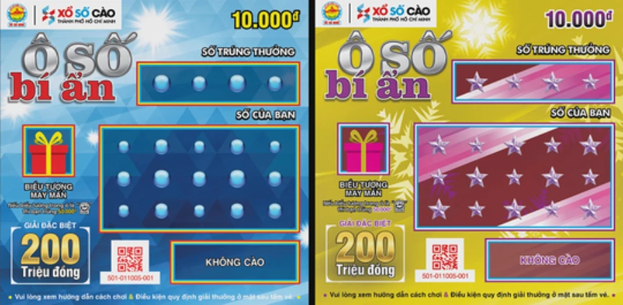 Đại diện Công ty TNHH MTV Xổ số kiến thiết TP.HCM cho biết thời gian đầu, công ty sẽ phát hành hai loại vé cào màu xanh và vàng với tên gọi trò chơi “ô số bí ẩn”, giải thấp nhất thuộc nhóm khuyến khích trúng 10.000 đồng. Giải đặc biệt thuộc nhóm hấp dẫn với giải thưởng lên đến 200 triệu đồng. Dịp Tết nguyên đán giá trị giải thưởng sẽ tăng lên 300 triệu đồng.