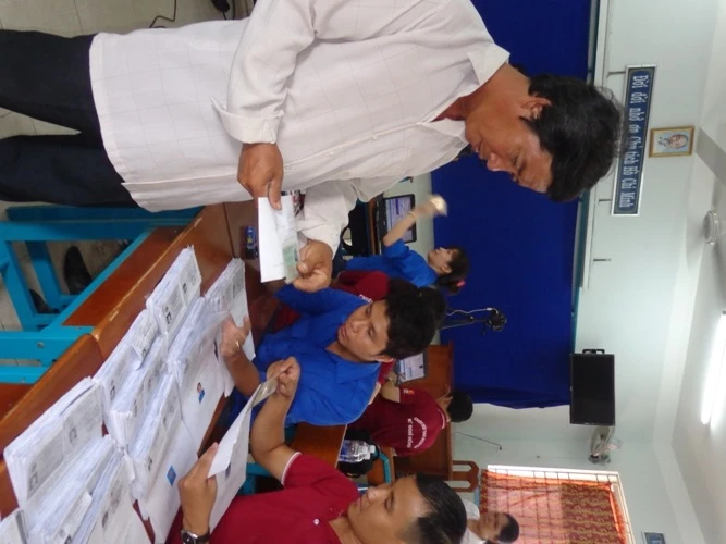 Đó là một phòng học được mượn đỡ làm phòng lập hồ sơ, chụp ảnh, trao giấy hẹn. Tấm bảng được che tạm bằng vải xanh làm font chụp hình.