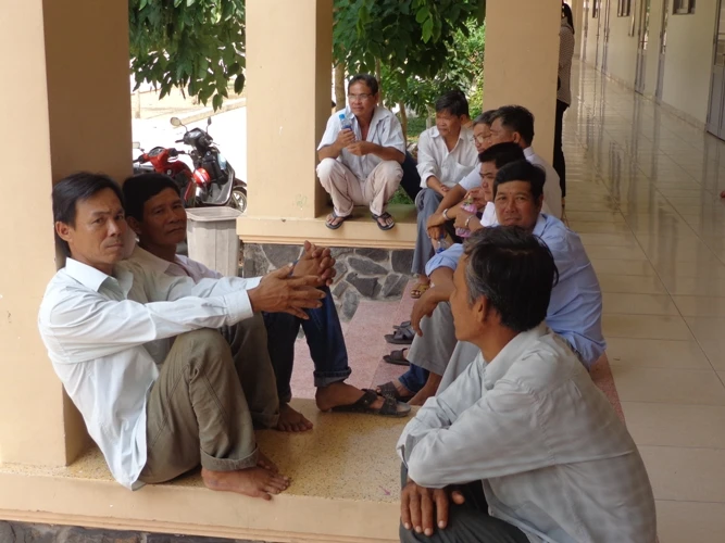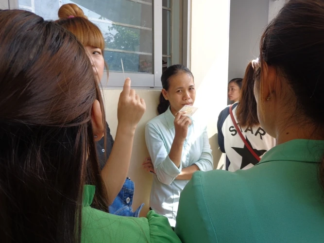 Ngay từ sáng sớm, nhiều người dân đến từ các xã Bình Khánh, Tam Thôn Hiệp, An Thới Đông đã đổ về Trường THCS Bình Khánh ngồi bên hành lang các lớp học để đợi đổi bằng lái.