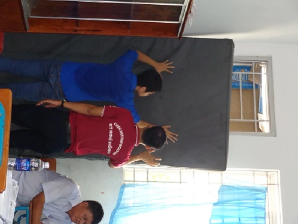 Dường như ánh nắng chói chang bên ngoài đã làm hỏng tấm ảnh. Các nhân viên tổ công tác có “sáng kiến” dựng tấm đệm vừa tìm được ở phòng tập thể dục để che bớt ánh sáng từ bên ngoài.