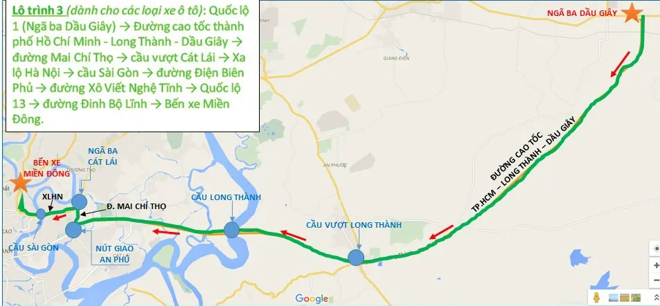 + Dành cho các loại ô tô: Quốc lộ 1 (ngã ba Dầu Giây) → đường cao tốc TP.HCM - Long Thành - Dầu Giây → đường Mai Chí Thọ → cầu vượt Cát Lái → xa lộ Hà Nội → cầu Sài Gòn → đường Điện Biên Phủ → đường Xô Viết Nghệ Tĩnh → quốc lộ 13 → đường Đinh Bộ Lĩnh → Bến xe Miền Đông.