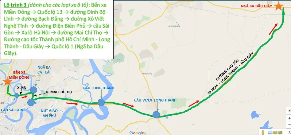 + Dành cho các loại ô tô: Bến xe Miền Đông → quốc lộ 13 → đường Đinh Bộ Lĩnh → đường Bạch Đằng → đường Xô Viết Nghệ Tĩnh → đường Điện Biên Phủ → cầu Sài Gòn → xa lộ Hà Nội → đường Mai Chí Thọ → đường cao tốc TP.HCM - Long Thành - Dầu Giây → quốc lộ 1 (ngã ba Dầu Giây).