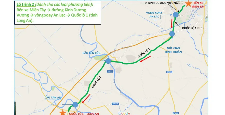 Lộ trình 2 (dành cho các loại phương tiện): Bến xe Miền Tây → đường Kinh Dương Vương → vòng xoay An Lạc → quốc lộ 1 (Long An).
