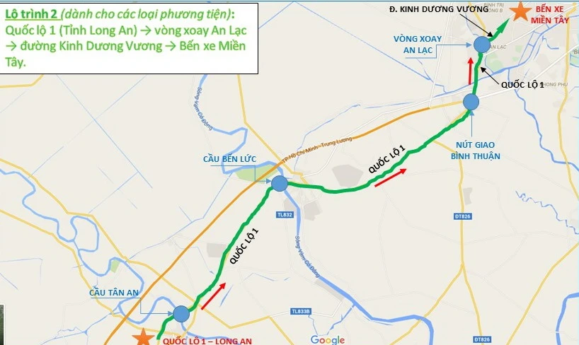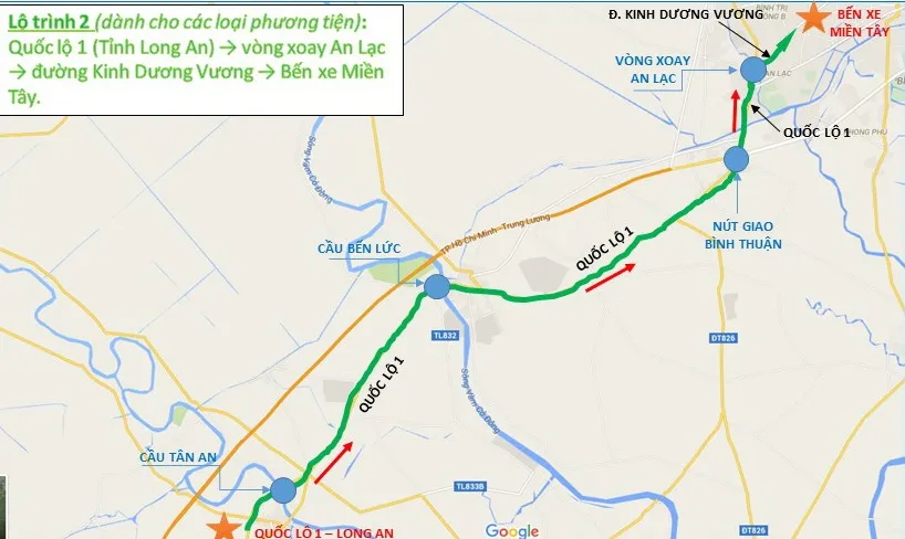 Lộ trình 2 (dành cho các loại phương tiện): Quốc lộ 1 (Long An) → vòng xoay An Lạc → đường Kinh Dương Vương → Bến xe Miền Tây.